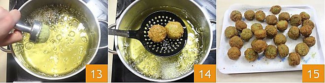 Lâchez la manette et versez le falafel directement dans l'huile chaude 13, retournez les falafels de temps en temps et retirez-les lorsqu'ils sont dorés 14. Égouttez-les sur une feuille de papier absorbant 15 et salez-les légèrement, si vous le souhaitez. Servez vos falafels de fèves chauds!