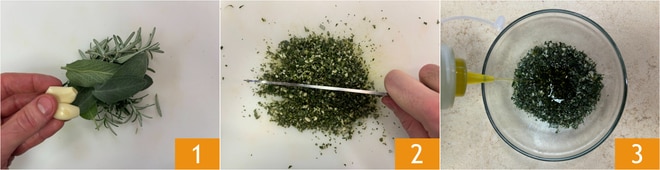 Pour préparer la pintade au four, commencez par hacher finement 2 gousses d'ail épluchées, une branche de romarin et 3 feuilles de sauge 1 2. Transférez le tout dans un bol et assaisonnez avec de l'huile 3.