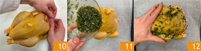 Passez la ficelle autour des ailes et nouez-la en haut 10, de cette façon la pintade gardera sa forme à la cuisson. Placez la pintade sur une plaque recouverte de papier sulfurisé, versez les herbes hachées sur la pintade 11 et massez la viande 12 pour répartir les herbes sur toute la surface. Cuisez au four ventilé préchauffé à 180°C pendant 20 minutes.