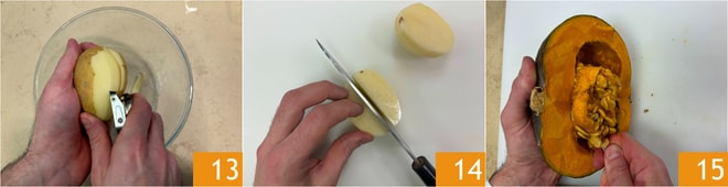 Entre-temps, épluchez les pommes de terre 13 et coupez-les en quartiers 14. Éliminez les graines et les filaments internes de la courge 15.