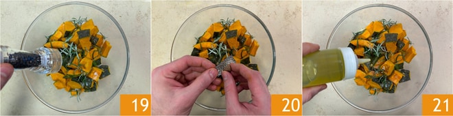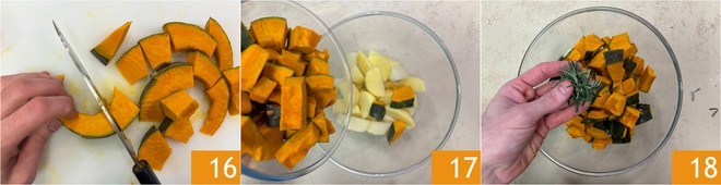 Ensuite, coupez-la en cubes de 3 cm 16. Transférez les pommes de terre et la courge dans un bol 17, puis assaisonnez avec du romarin 18.