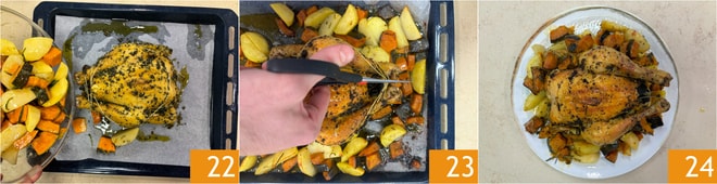 Ajoutez les légumes dans la plaque, avec la pintade 22, coupez la ficelle 23 et continuez la cuisson de la même manière pendant encore 40 minutes. Sortez du four, laissez reposer la pintade pendant 10 minutes, puis dressez. Votre pintade au four est prête à être servie 24!