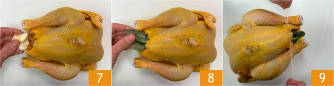 Garnissez la pintade avec deux autres gousses d'ail écrasées 7, trois feuilles de sauge 8 et une branche de romarin. Attachez les cuisses de la pintade avec de la ficelle 9.