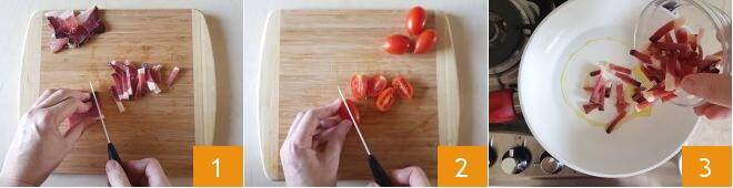 Pour préparer les farfalle avec crème de parmesan, speck et pistaches, commencez par couper le speck en lanières d'environ 0,5 cm 1; lavez, séchez et coupez les tomates cerises en 8 parties 2. Dans une grande poêle, versez un filet d'huile, ajoutez le speck 3 et laissez rissoler quelques instants.