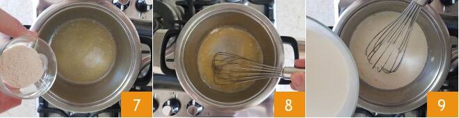 faites-le fondre à feu très doux, ajoutez la farine 7 et mélangez avec un fouet jusqu'à obtenir une crème lisse 8, ajoutez la crème 9,