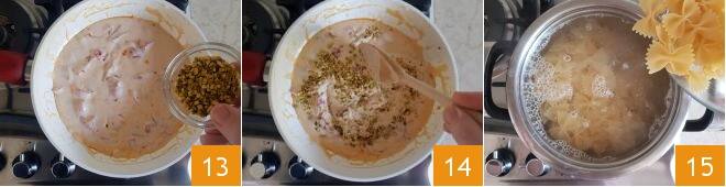 mélangez et ajoutez la poudre de pistaches (laissez-en 10 g de côté pour la décoration finale de l'assiette) 13, mélangez à nouveau 14 et remettez sur le feu à feu très doux. Faites cuire les farfalle une minute de moins que le temps indiqué sur l'emballage 15