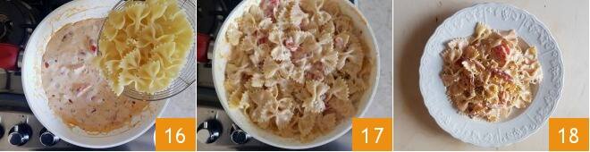 et versez-les directement dans la sauce 16, mélangez pour bien amalgamer le tout 17, servez immédiatement en garnissant chaque assiette de farfalle avec crème de Parmesan, speck et poudre de pistaches avec un peu de la poudre mise de côté 18.