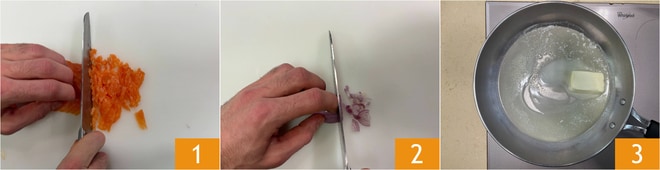 Pour préparer les farfalles au saumon fumé, commencez par hacher au couteau le saumon fumé 1, puis nettoyez et hachez finement l'échalote 2. Dans une poêle, faites fondre le beurre 3.