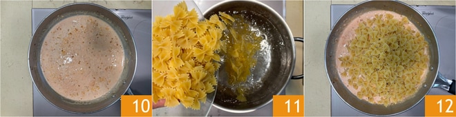 Mélangez pour amalgamer les ingrédients et faites cuire encore quelques minutes à feu doux 10. Entre-temps, faites cuire les farfalles dans une grande quantité d'eau salée 11. Égouttez les pâtes al dente et transférez-les dans la poêle 12.
