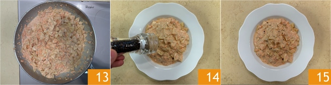 Faites sauter brièvement le tout 13. Dressez sur les assiettes et complétez avec un tour de moulin à poivre 14. Vos farfalles au saumon fumé sont prêtes à être servies 15 !