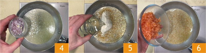 Ajoutez l'échalote 4 et faites-la revenir quelques minutes, puis déglacez avec le vin blanc 5. Lorsque toute la partie alcoolique sera évaporée, ajoutez le saumon 6 et faites cuire pendant 2 minutes.