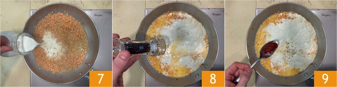 Ajoutez la crème 7, puis assaisonnez avec le poivre 8 et le concentré de tomate 9.