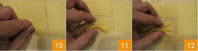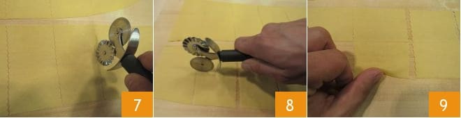 Sur les feuilles obtenues, passez une roulette à pâte pour réaliser des rectangles, de cette manière : créez des bandes verticales de 7 cm de large avec la partie dentelée 7, puis coupez horizontalement avec la partie lisse, pour former des côtés de 4 cm 8. Pour former les farfalle, vous devrez utiliser le pouce et l'index : avec le pouce, soulevez un bord de pâte au milieu du rectangle 9