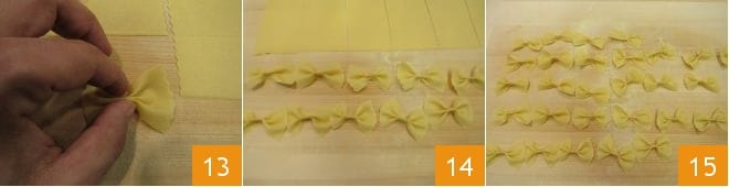 Puis serrez au centre 13 pour fixer la forme des farfalle 14 ; continuez avec toute la pâte. Au fur et à mesure, vous pouvez les disposer sur un plateau et terminer la pâte fraîche. Au fur et à mesure que vous réalisez les farfalle, vous pouvez les disposer sur un plateau légèrement fariné, peut-être avec de la semoule si vous préférez pour qu'elle ne soit pas absorbée par les pâtes fraîches 15, puis laissez-les sécher pendant environ 30 minutes. Vos farfalle cuiront en 5 minutes dans de l'eau bouillante salée à votre goût !