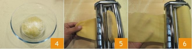 Donnez à la pâte une forme sphérique et enveloppez-la dans un film plastique 4 ; laissez reposer la pâte fraîche pendant au moins 20 minutes. Ensuite, reprenez la pâte et divisez-la en quatre. Passez le premier morceau (laissez les autres enveloppés dans le film plastique jusqu'à ce que vous les étaliez) et insérez-le dans la machine à pâtes 5, vous devrez le travailler de l'épaisseur la plus grande jusqu'à l'avant-dernière, en repassant la pâte à cette épaisseur plusieurs fois jusqu'à obtenir des feuilles d'une épaisseur de 1 mm, donc vraiment très fines 6.