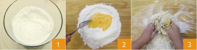 Pour réaliser les farfalle, commencez par peser la farine, puis versez-la sur le plan de travail (gardez un peu de farine de côté, à ajouter si la pâte est trop molle) 1, formez un puits au centre et ajoutez les œufs. Commencez à mélanger avec une fourchette en incorporant progressivement la farine autour 2, puis continuez à la main jusqu'à obtenir une consistance lisse et élastique.