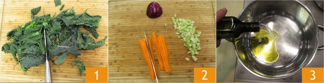 Pour préparer la farinata de chou et borlotti, commencez par retirer la tige du chou noir et coupez-le finement 1. Épluchez les carottes, le céleri et l'oignon et hachez-les finement pour le soffritto 2. Faites chauffer un filet d'huile dans une casserole haute avec l'ail 3.