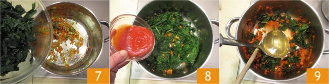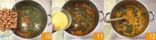Incorporez également les haricots égouttés 10 et poursuivez pendant encore 30 minutes. À ce moment, ajoutez la farine de maïs pour polenta instantanée et faites cuire le temps nécessaire pour qu'elle soit absorbée 11. Une fois que la farinata aura pris une consistance dense, elle sera prête 12. Servez-la chaude avec un filet d'huile crue.