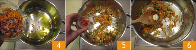 Ajoutez les légumes 4, le piment 5 et quelques feuilles de sauge. Faites revenir et ensuite retirez l'ail 6.
