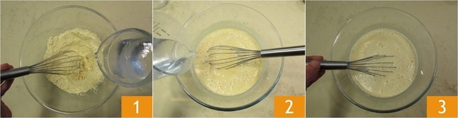 Pour préparer la farinata de pois chiches aux artichauts, mettez dans un saladier la farine de pois chiches et versez au centre un peu d'eau à température ambiante 1. Mélangez bien le tout en faisant attention à ne pas former de grumeaux et continuez à verser l'eau 2 jusqu'à obtenir un mélange liquide et homogène 3.