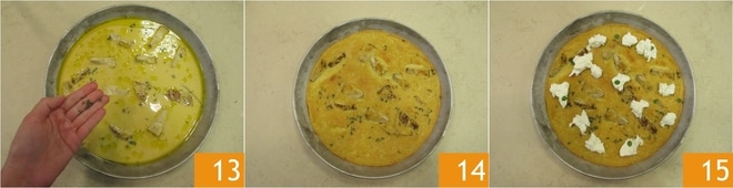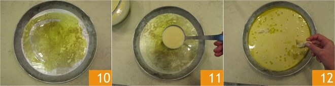 Graissez 3 plaques de 32 cm de diamètre avec de l'huile d'olive extra vierge en abondance (la tradition voudrait que l'on utilise des plaques en cuivre ou en aluminium, mais vous pouvez également utiliser une simple plaque antiadhésive) 10, et avec une louche, répartissez-y le mélange de pois chiches 11. Prenez en compte qu'il en faudra 1/3 pour chacune. Ajoutez les artichauts à l'huile précédemment coupés 12.