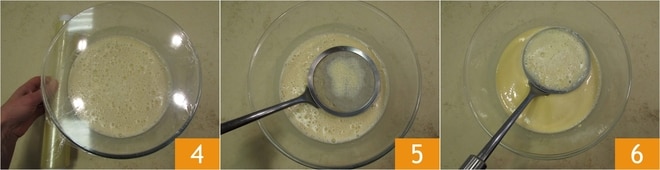 Couvrez avec du film alimentaire et laissez reposer le mélange hors du frigo entre un minimum de 5 heures et un maximum de 10 heures, en mélangeant de temps en temps. Une fois le temps écoulé, vous remarquerez de la mousse à la surface : retirez-la avec une écumoire 5, jusqu'à l'éliminer complètement 6.