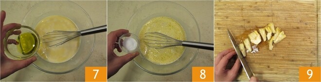 Ajoutez au mélange 20 g d'huile 7 et le sel 8. Mélangez bien en remuant avec un fouet. Égouttez bien les petits artichauts et coupez-les en quartiers ou simplement en deux s'ils ne sont pas très gros 9.