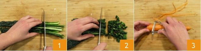 Pour préparer la farinata luquoise en cuisson en bocal, commencez par préparer le bouillon de légumes. Ensuite, lavez et épluchez tous les légumes, éliminez la partie coriace de la tige des feuilles de chou 1 et réduisez les feuilles en morceaux d'environ 1,5-2 cm 2. Épluchez les carottes 3.
