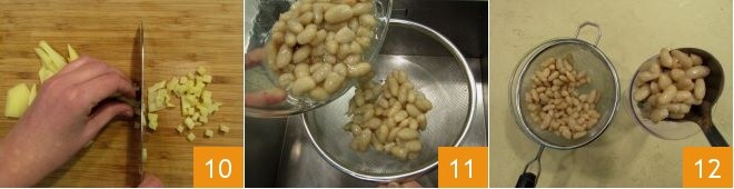 puis des dés d'environ 0,7 cm 10. Gardez les légumes de côté. Égouttez les haricots de leur liquide de conservation 11 et prenez-en la moitié pour les transférer dans le verre d'un mixeur 12.