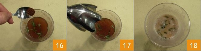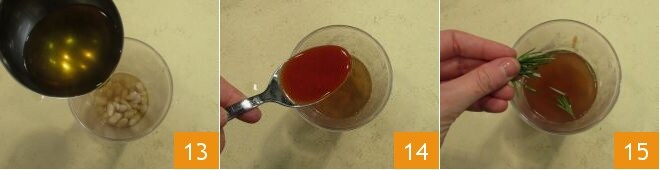 Ajoutez environ 4 louches de bouillon chaud 13, 2 cuillères à soupe de coulis de tomates 14, quelques aiguilles de romarin 15.