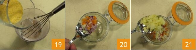 Ajoutez maintenant la farine en pluie 19 et mélangez bien. Vous pouvez composer les petits bocaux (utilisez des petits bocaux à fermeture hermétique, neufs et dotés de joints en caoutchouc) : versez dans chacun un peu de légumes (céleri, carotte, oignon) 20, quelques dés de pomme de terre 21.