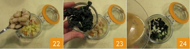 quelques haricots entiers 21, un peu de chou noir 21 et couvrez à niveau avec le mélange de bouillon de haricots et de farine de maïs 24.