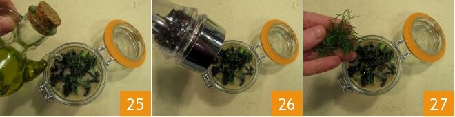 Complétez avec un filet d'huile d'olive de qualité 25, un tour de moulin de poivre 26 et quelques brins de fenouil sauvage 27.