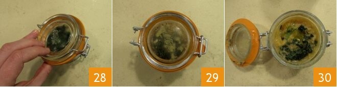 Fermez hermétiquement les bocaux 28 et cuisez au micro-ondes à 450 w pendant environ 5-7 minutes (cela dépend de la taille, de la dureté des légumes et du bocal utilisé). Une fois prêts, laissez reposer quelques minutes 29 avant d'ouvrir ; pour ouvrir, vous devrez maintenir le couvercle du petit bocal avec une main et tirer la languette du joint en caoutchouc avec l'autre. Dégustez la farinata luquoise en cuisson en bocal 30 !
