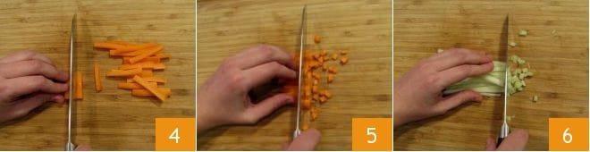et coupez-les en bâtonnets 4 puis en dés de 0,5 cm 5. Procédez de la même manière pour le céleri 6.