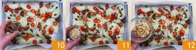 Ajoutez aussi les anchois 10 et les pignons de pin 11, puis saupoudrez de chapelure 12 et d'origan séché.
