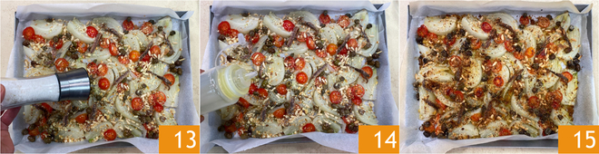 Salez 13, poivrez et enfin arrosez d'un filet d'huile 14. Faites cuire dans un four statique préchauffé à 180°C pendant environ 20 minutes ou jusqu'à ce qu'une croûte dorée se forme à la surface. Sortez du four et servez vos fenouils gratinés à la méditerranéenne immédiatement 15 !