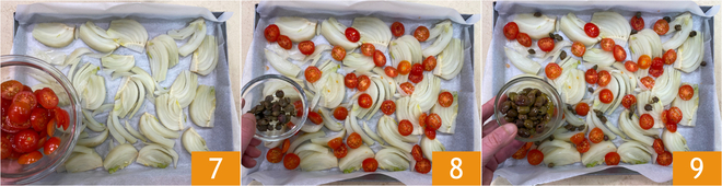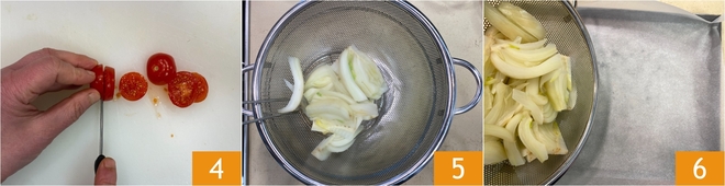 Entre-temps, coupez les tomates cerises en tranches 4. Égouttez les fenouils 5 et disposez-les sur une plaque recouverte de papier sulfurisé 6.