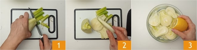 Pour préparer les fenouils au four, commencez par nettoyer les fenouils en éliminant les extrémités 1 ; vous obtiendrez environ 800 grammes. Coupez-les ensuite en tranches d'environ 1 cm d'épaisseur 2. Au fur et à mesure, placez-les dans un bol avec de l'eau froide et le jus de citron 3.