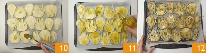Égouttez les fenouils, tamponnez-les avec un torchon propre et placez-les de manière ordonnée dans la plaque. Répartissez l'émulsion restante sur les fenouils 10, puis assaisonnez avec 2 cuillères à soupe d'huile 11. Faites cuire dans un four à chaleur tournante préchauffé à 200° pendant 25 minutes. Allumez ensuite le grill et laissez cuire encore 5 minutes. Vos fenouils au four sont prêts à être servis 12 !