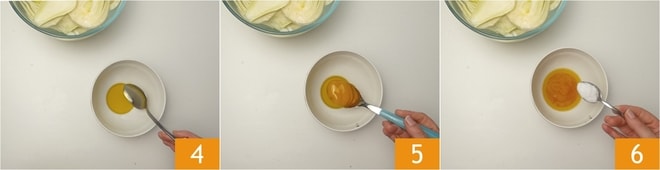 Entre-temps, préparez l'émulsion : dans un petit bol, versez l'huile 4, le miel 5 et une cuillère à café rase de sel 6.