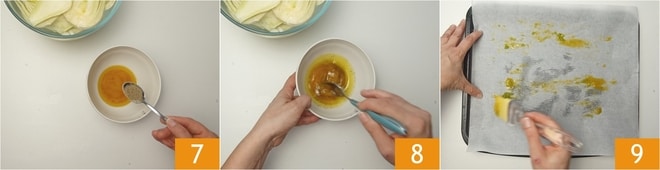 Ajoutez le poivre noir moulu 7 et mélangez vigoureusement avec une cuillère pour émulsionner 8. Couvrez une plaque de cuisson avec du papier sulfurisé et badigeonnez-la légèrement avec l'émulsion que vous venez de préparer 9.