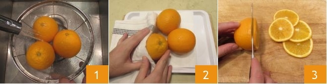 Pour réaliser les tranches d'oranges séchées, lavez les oranges sous l'eau courante 1, puis séchez-les 2 et coupez-les en tranches épaisses de 5 mm 3, vous devrez obtenir environ 14 tranches.