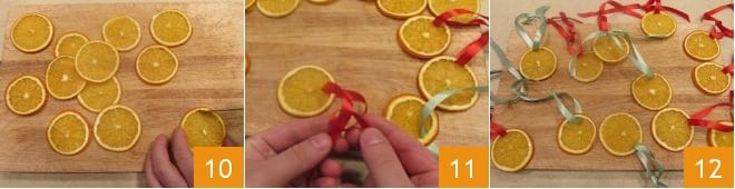 et sur chacune, pratiquez avec un petit couteau, une petite incision au niveau de l'écorce 10, passez-y le ruban de satin coloré 11, nouez-le pour créer un petit nœud. Vos tranches d'oranges séchées sont prêtes à être suspendues à votre sapin 12 !