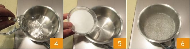 Préparez le sirop : dans une petite casserole, versez l'eau 4 et le sucre en poudre 5, chauffez le sirop jusqu'à ce qu'il frôle l'ébullition 6, puis éteignez le feu et transférez-le dans un petit bol,