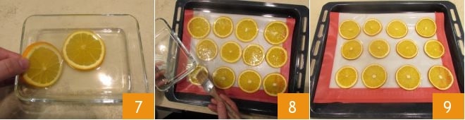 immergez chaque tranche d'orange dans le sirop de sucre 7. Transférez les tranches d'orange sur une plaque recouverte de papier sulfurisé ou un tapis en silicone spécifique pour la cuisson au four 8. Faites sécher les tranches dans un four statique préchauffé à 100° pour 2 heures en gardant la porte du four entrouverte. Ensuite, laissez sécher les tranches pendant encore 8 heures dans le four éteint et entrouvert. Une fois le temps écoulé, sortez les tranches d'oranges du four 9