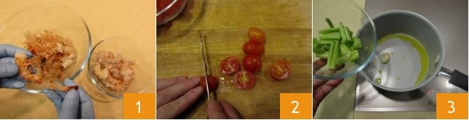 Pour préparer les fettuccine à la crème de crevettes et brandy, commencez par nettoyer les crevettes. Retirez la tête et la carapace 1, en les conservant car ils vous serviront pour la préparation de la crème. Coupez les tomates cerises en deux 2 et le céleri et les tiges de persil en morceaux assez grossiers. Placez une casserole antiadhésive sur le feu avec un filet d'huile et la gousse d'ail. Faites blondir l'ail, puis ajoutez le céleri 3 et