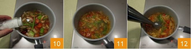et ajustez le sel et le poivre à votre goût 10; laissez cuire encore 10 minutes. Une fois prêt 11, mixez le tout avec un mixeur plongeant 12