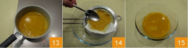 jusqu'à obtenir une crème dense et homogène 13, que vous filtrerez avec du papier cuisine dans une passoire fine placée sur un bol 14. Une fois ce procédé terminé, mettez la crème obtenue de côté 15.