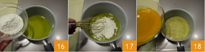 Faites chauffer l'huile restante et versez la farine petit à petit 16, en mélangeant bien avec le fouet pour éviter la formation de grumeaux 17. Versez la crème 18